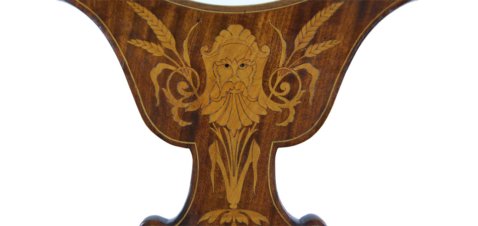 Condition: Very good original condition, structurally sound, very minor knocks/dents/scuffs commensurate with age and past use; beautiful colour throughout, marquetry all intact, though shows signs of age-related wear. There is a very small mahogany veneer loss to the side of a splat of one of the chairs, visible only on close scrutiny and does not affect the marquetry (photos may be provided upon request).
